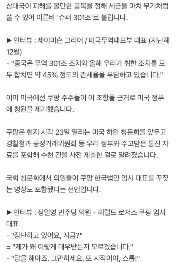 "몽둥이가 모자라다" 발언까지 제출한 쿠팡…한국, 미국 무역보복 대상되나