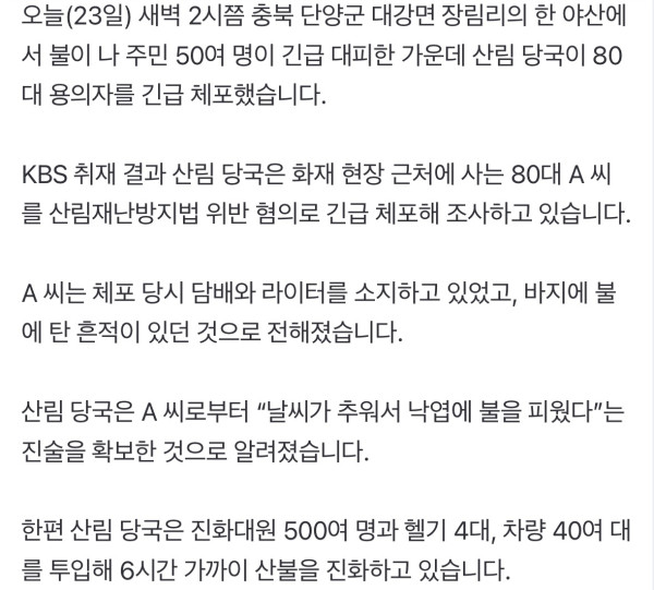 [속보]“추워서 낙엽 태워” 단양산불 80대 용의자 긴급체포