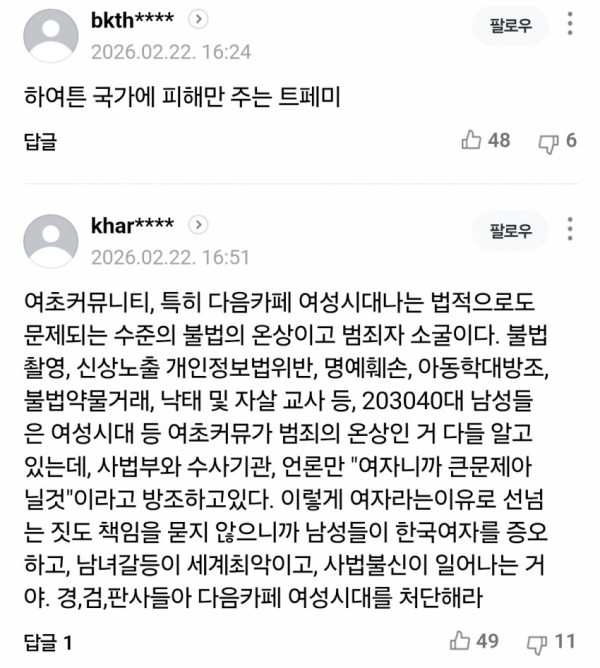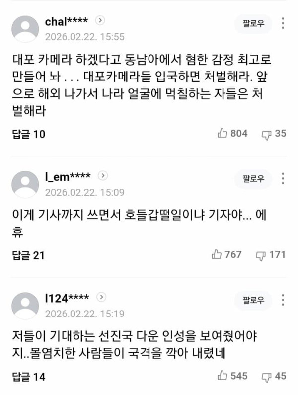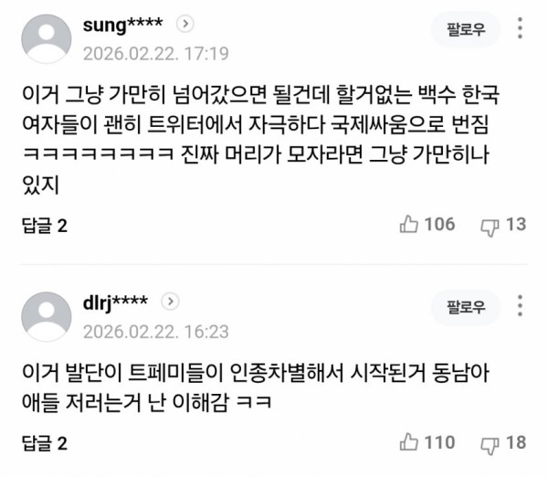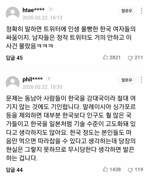 동남아 vs 한녀충 사건 네이버 댓글 반응