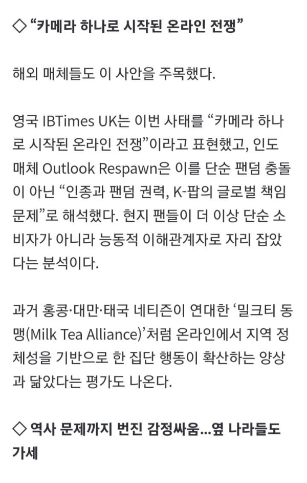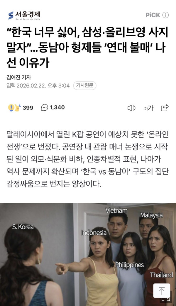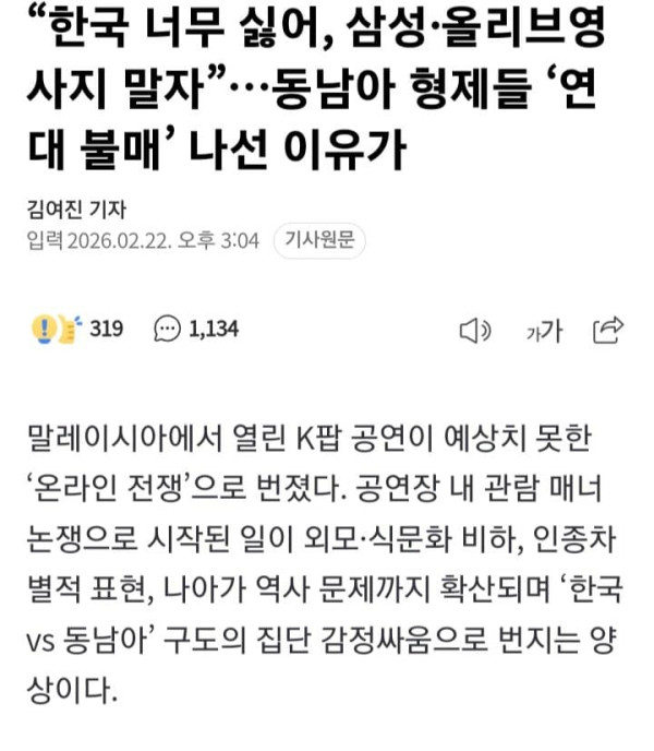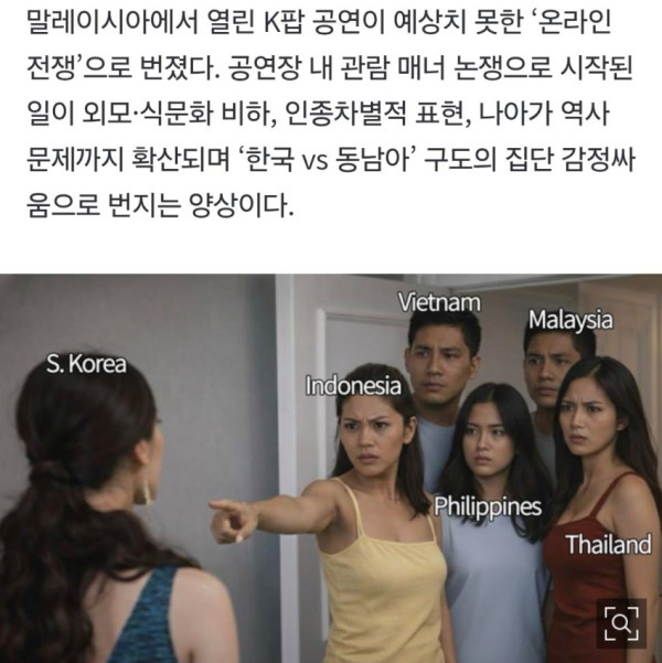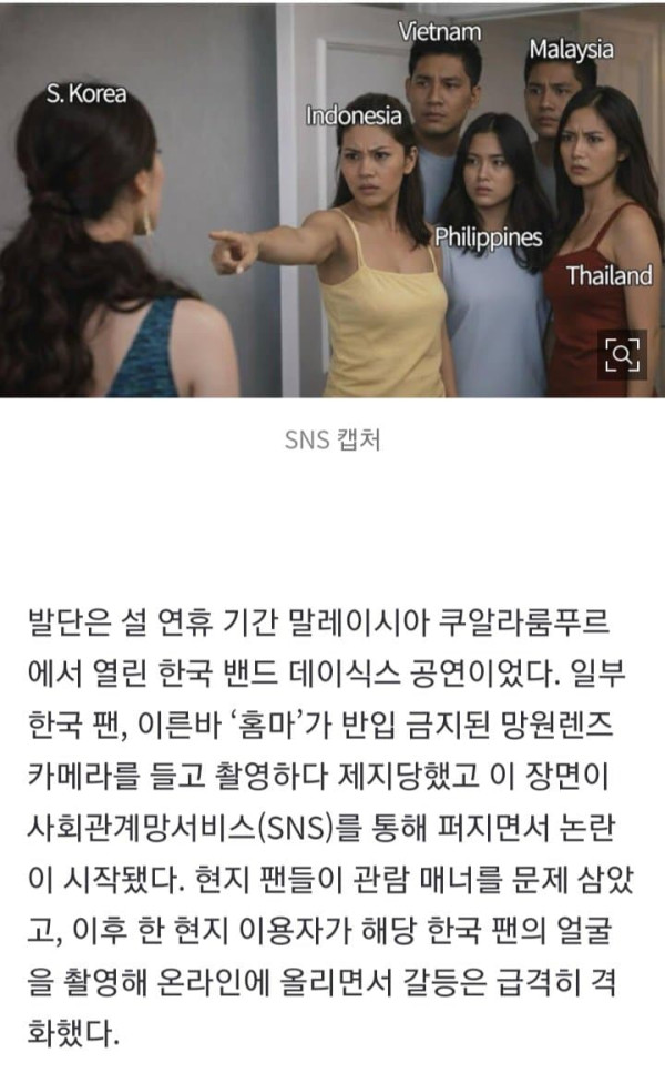 말레이시아에서 열린 K팝 공연이 예상치 못한 ‘온라인 전쟁’으로 번졌다. 공연장 내 관람 매너 논쟁으로 시작된 일이 외모·식문화 비하, 인종차별적 표현, 나아가 역사 문제까지 확산되며 ‘한국 vs 동남아’ 구도의 집