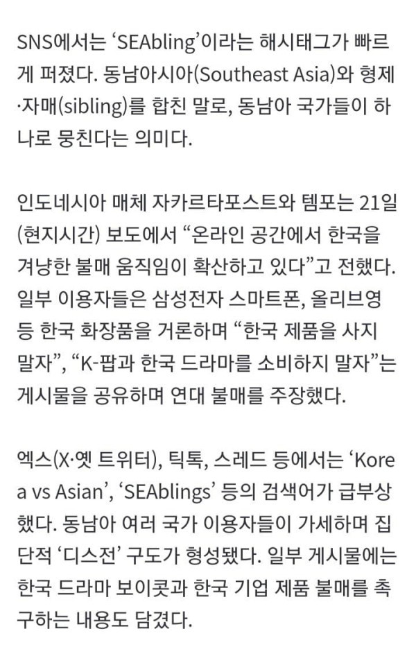 “한국 너무 싫어, 삼성·올리브영 사지 말자”…동남아 형제들 ‘연대 불매’ 나선 이유가