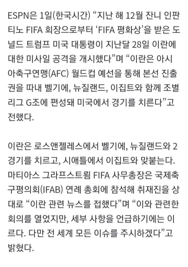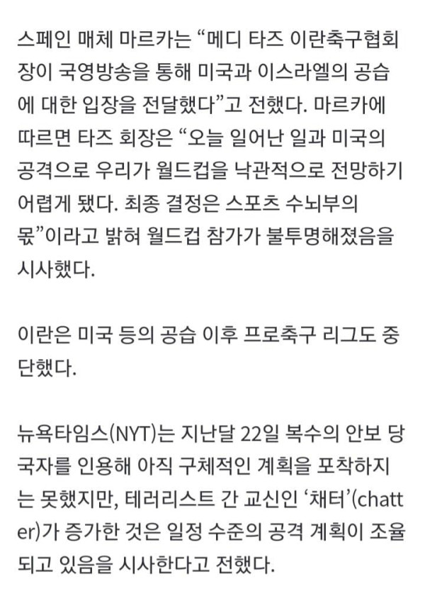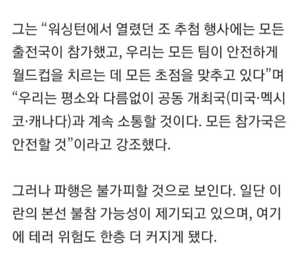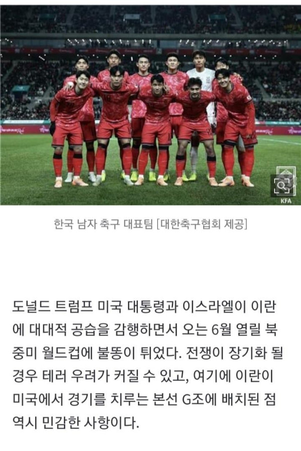 도널드 트럼프 미국 대통령과 이스라엘이 이란에 대대적 공습을 감행하면서 오는 6월 열릴 북중미 월드컵에 불똥이 튀었다. 전쟁이 장기화 될 경우 테러 우려가 커질 수 있고, 여기에 이란이 미국에서 경기를 치루는 본선