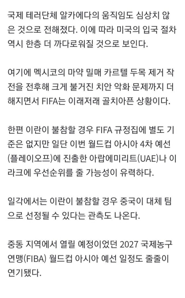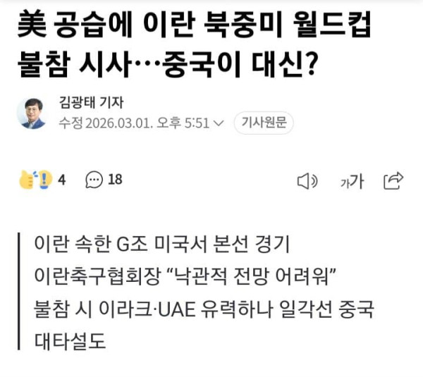 美 공습에 이란 북중미 월드컵 불참 시사…중국이 대신?