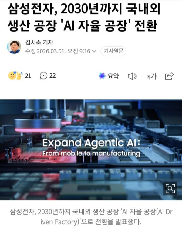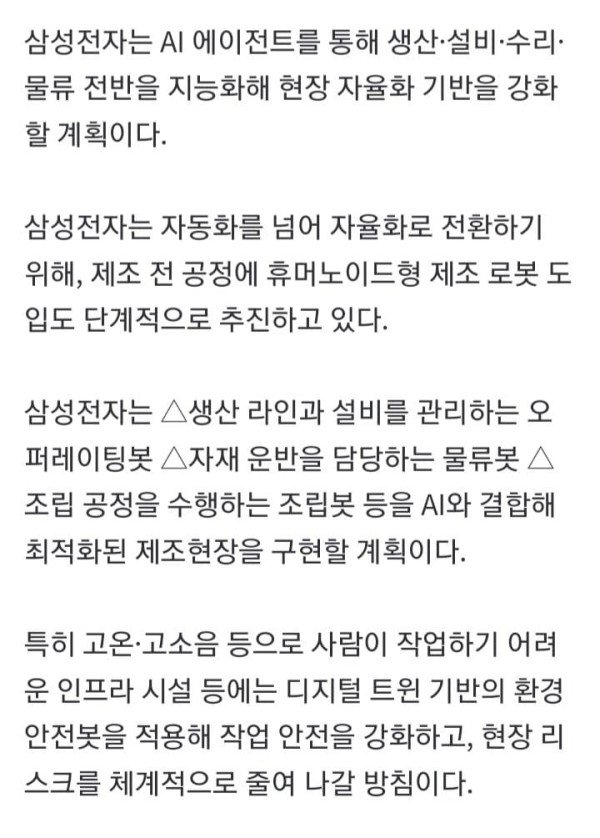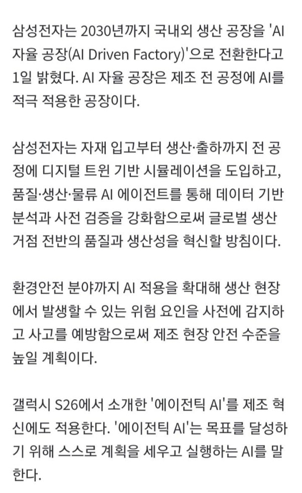 삼성전자는 2030년까지 국내외 생산 공장을 'AI 자율 공장(AI Driven Factory)'으로 전환한다고 1일 밝혔다. AI 자율 공장은 제조 전 공정에 AI를 적극 적용한 공장이다. 삼성전자는 자재 입고부터