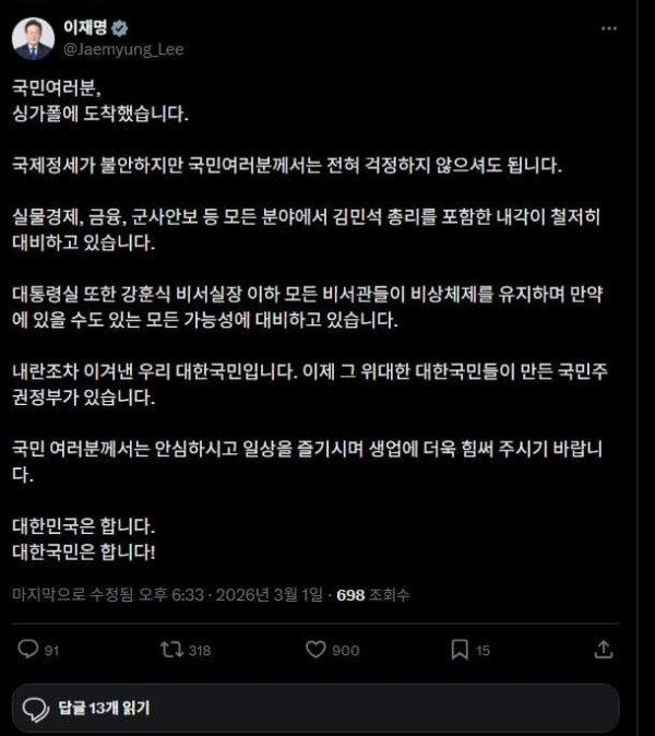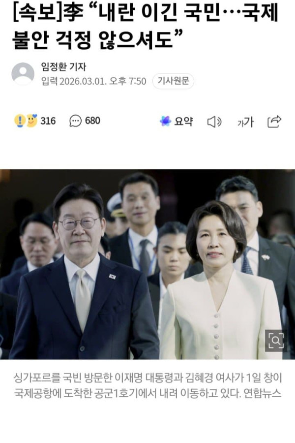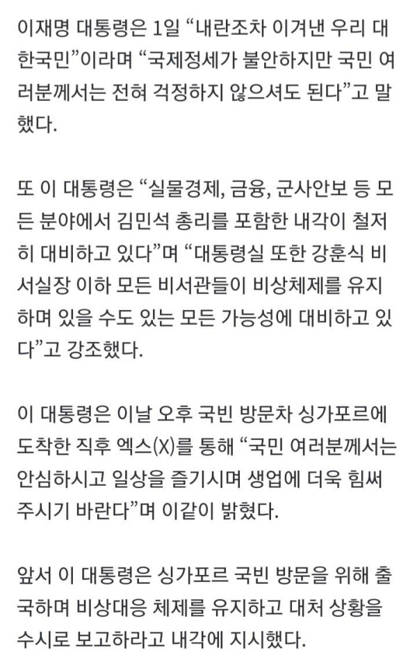 싱가포르를 국빈 방문한 이재명 대통령과 김혜경 여사가 1일 창이 국제공항에 도착한 공군1호기에서 내려 이동하고 있다. 연합뉴스 이재명 대통령은 1일 “내란조차 이겨낸 우리 대한국민”이라며 “국제정세가 불안하지만 국민