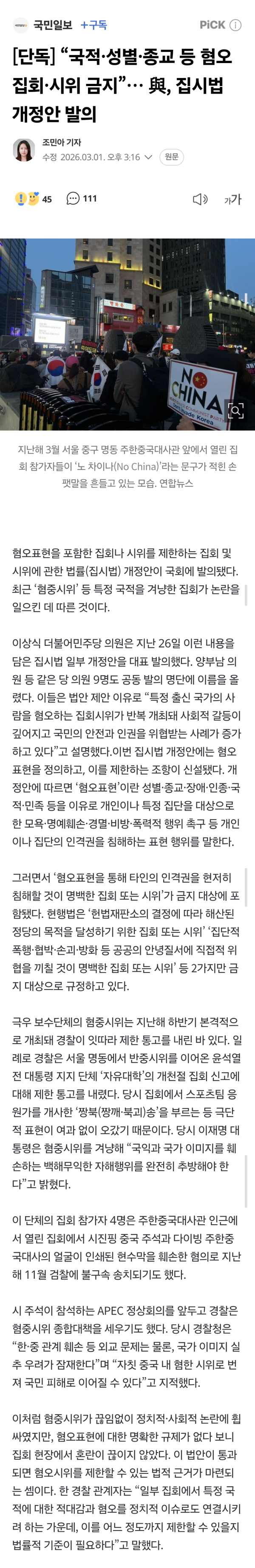 “국적·성별·종교 등 혐오 시위 금지”…與 집시법 개정안 발의
