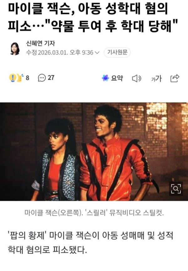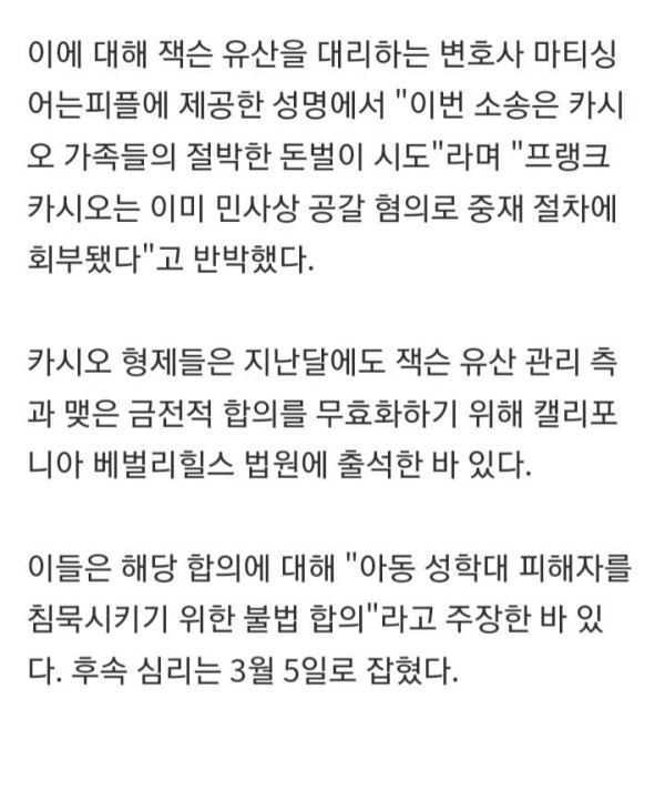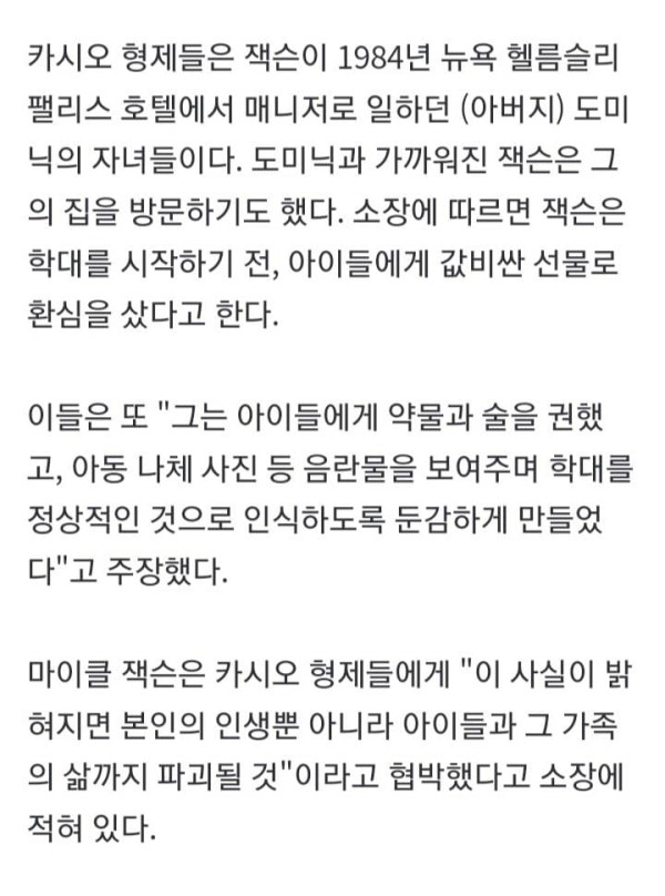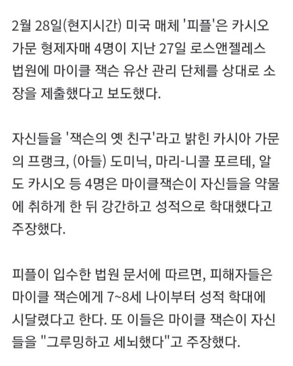 '팝의 황제' 마이클 잭슨이 아동 성매매 및 성적 학대 혐의로 피소됐다. 2월 28일(현지시간) 미국 매체 '피플'은 카시오 가문 형제자매 4명이 지난 27일 로스앤젤레스 법원에 마이클 잭슨 유산 관리 단체를 상대로