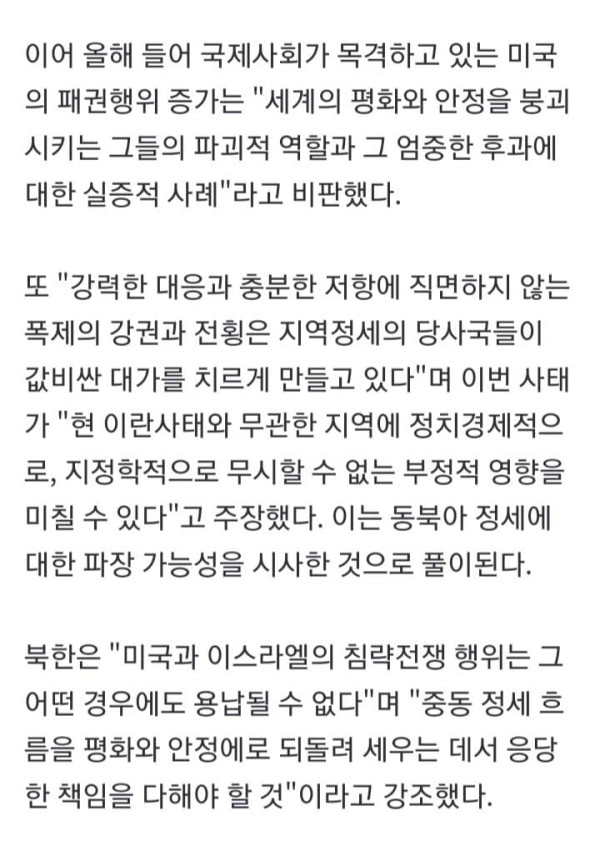 북한 "美·이스라엘 이란 공습은 불량배적 행태" 규탄 [美 이란 공습]