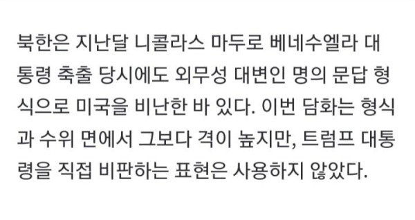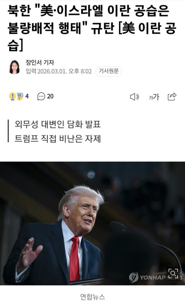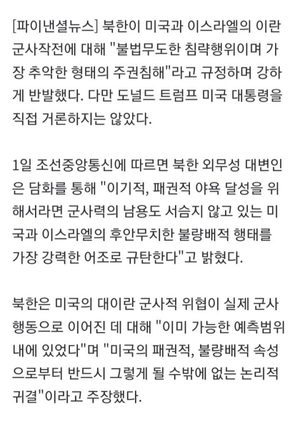 북한이 미국과 이스라엘의 이란 군사작전에 대해 "불법무도한 침략행위이며 가장 추악한 형태의 주권침해"라고 규정하며 강하게 반발했다. 다만 도널드 트럼프 미국 대통령을 직접 거론하지는 않았다. 1일 조선중앙통신에 따르