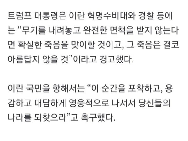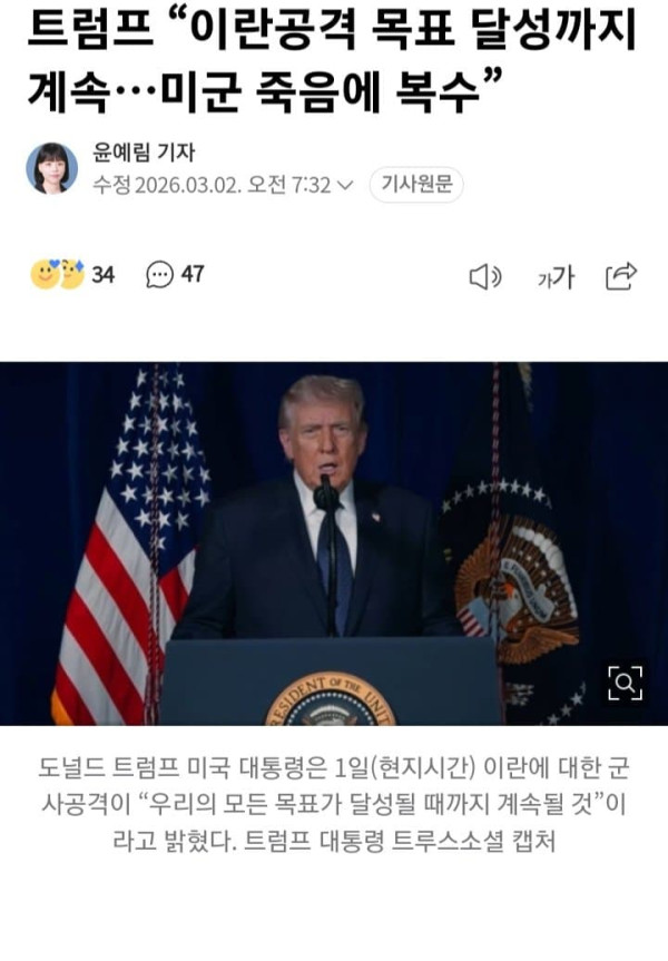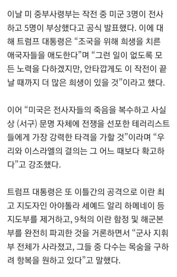 트럼프 “이란공격 목표 달성까지 계속…미군 죽음에 복수”