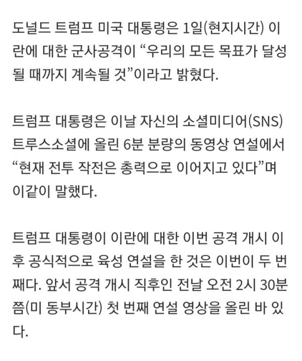 도널드 트럼프 미국 대통령은 1일(현지시간) 이란에 대한 군사공격이 “우리의 모든 목표가 달성될 때까지 계속될 것”이라고 밝혔다. 트럼프 대통령은 이날 자신의 소셜미디어(SNS) 트루스소셜에 올린 6분 분량의 동영상