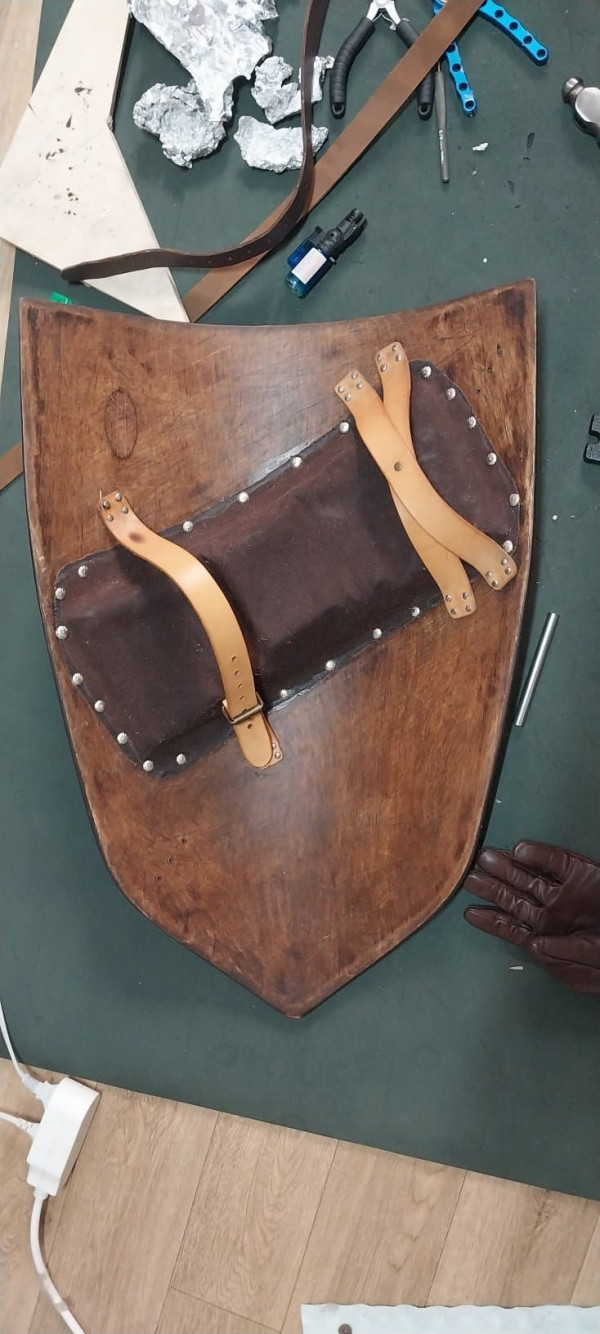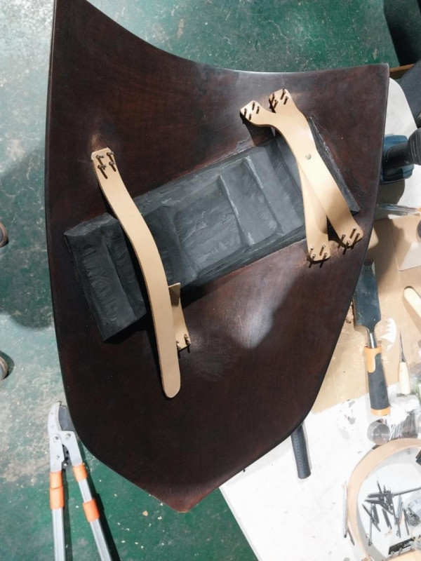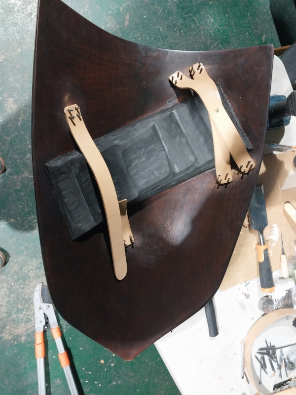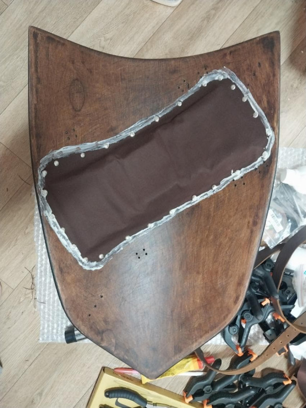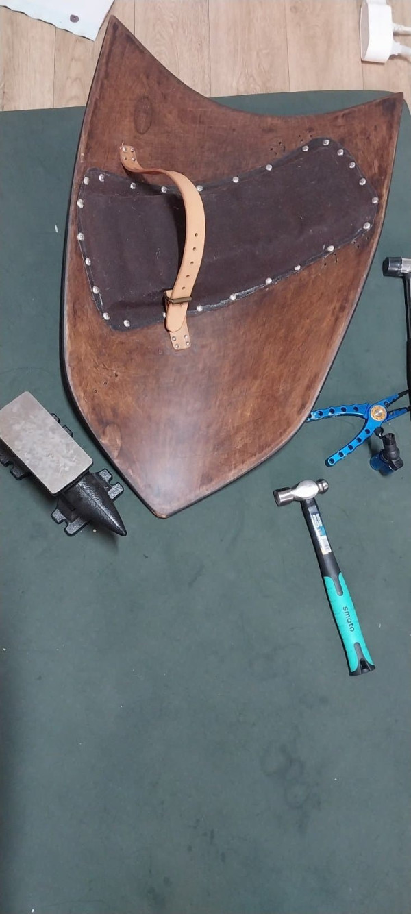 손잡이(Enarmes) 장착, 일단 한쪽에 못 4개를 두드려서 리베팅 하고나면 생각 이상으로 고정은 단단하게 느껴짐