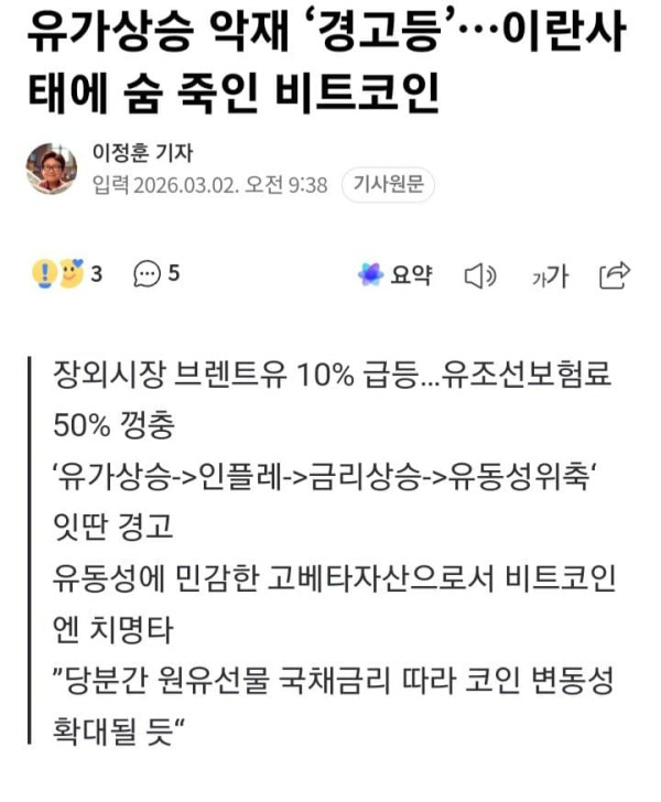 유가상승 악재 ‘경고등’…이란사태에 숨 죽인 비트코인