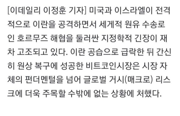 미국과 이스라엘이 전격적으로 이란을 공격하면서 세게적 원유 수송로인 호르무즈 해협을 둘러싼 지정학적 긴장이 재차 고조되고 있다. 이란 공습으로 급락한 뒤 간신히 원상 복구에 성공한 비트코인시장은 시장 자체의 펀더멘털