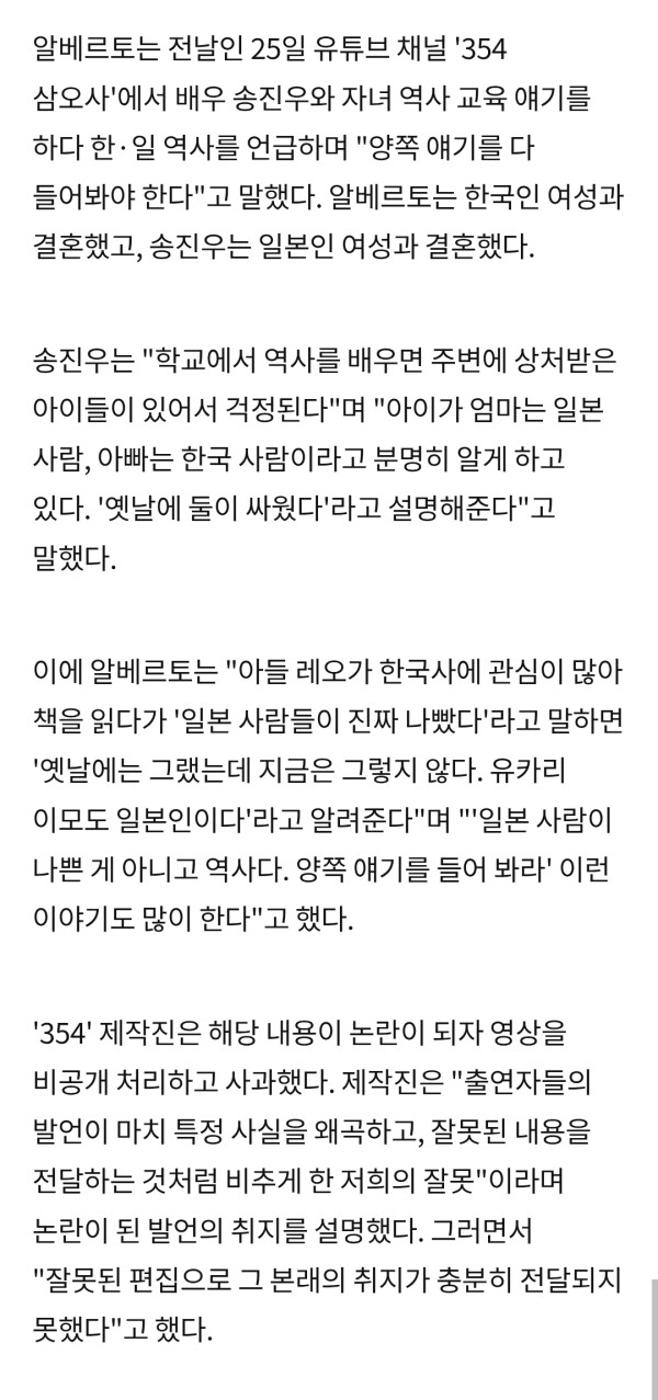 알베르토, '한일 역사 양쪽 얘기' 발언 사과