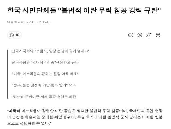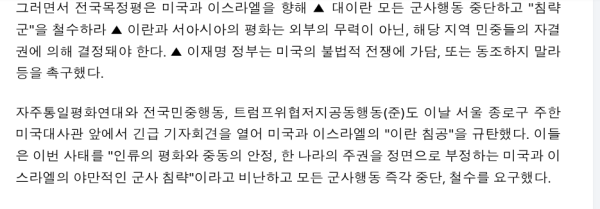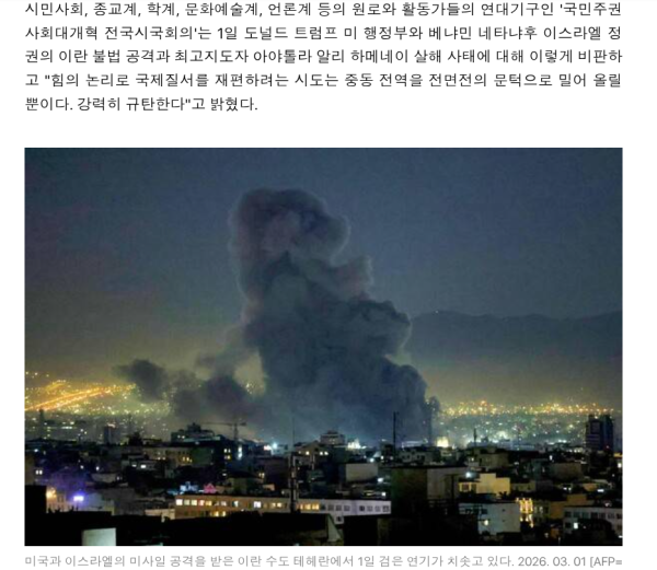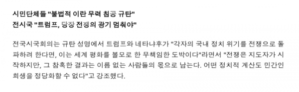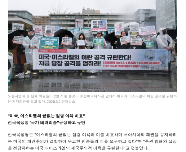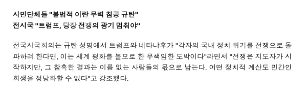 한국 시민단체들"불법적 이란 무력 침공 강력 규탄"