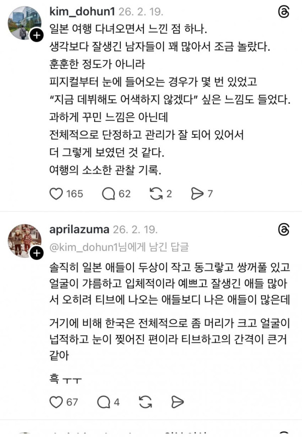 그 이유는 한국과 다르게 일본남자들 상당수가 이목구비 뚜렷하고 얼굴 머리크기 작은 미소년 미남비율이 압도적으로 많아서 충격먹고옴