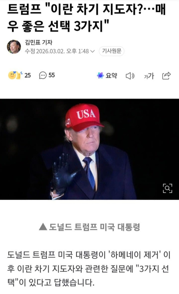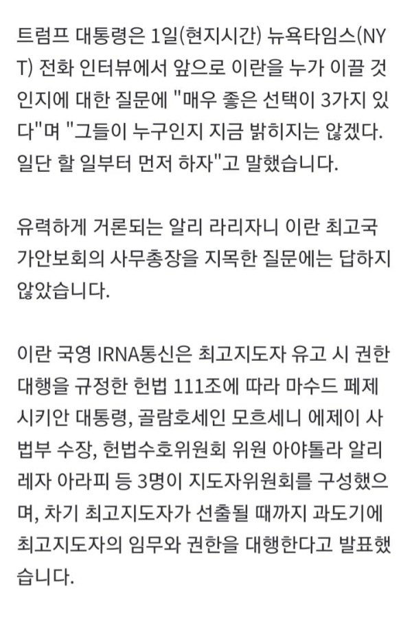 ▲ 도널드 트럼프 미국 대통령 도널드 트럼프 미국 대통령이 '하메네이 제거' 이후 이란 차기 지도자와 관련한 질문에 "3가지 선택"이 있다고 답했습니다. 트럼프 대통령은 1일(현지시간) 뉴욕타임스(NYT) 전화 인터