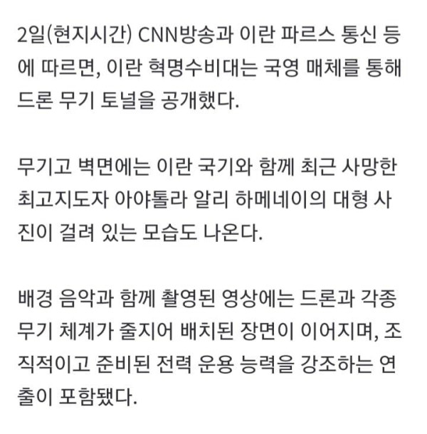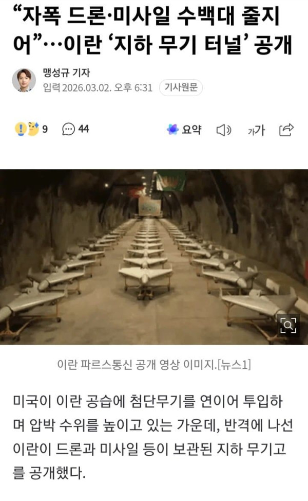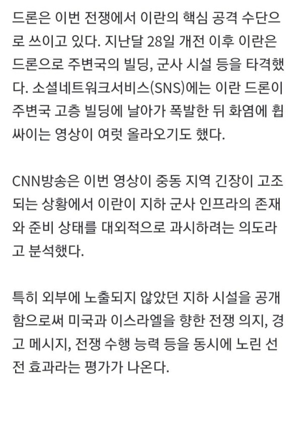 미국이 이란 공습에 첨단무기를 연이어 투입하며 압박 수위를 높이고 있는 가운데, 반격에 나선 이란이 드론과 미사일 등이 보관된 지하 무기고를 공개했다. 2일(현지시간) CNN방송과 이란 파르스 통신 등에 따르면, 이