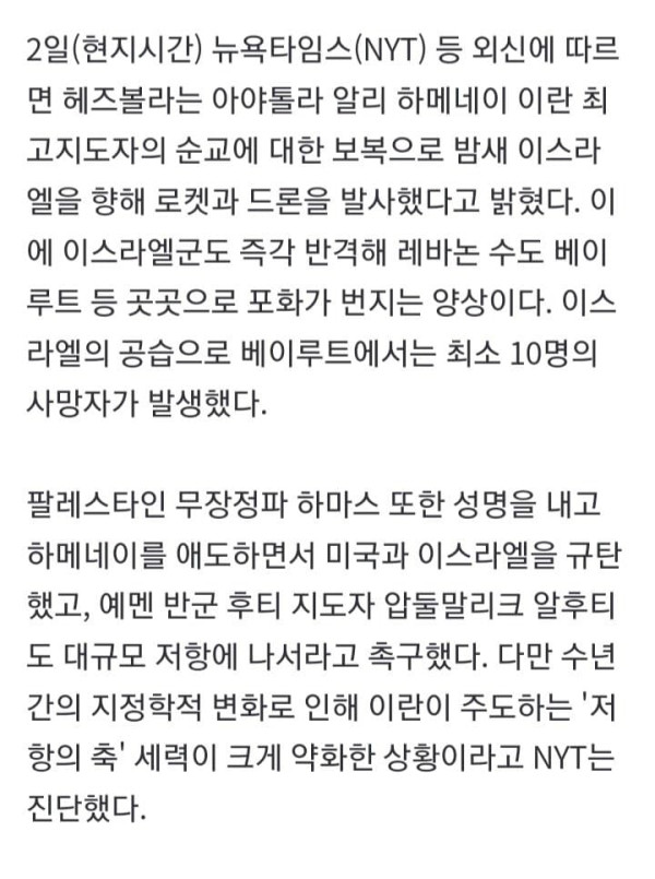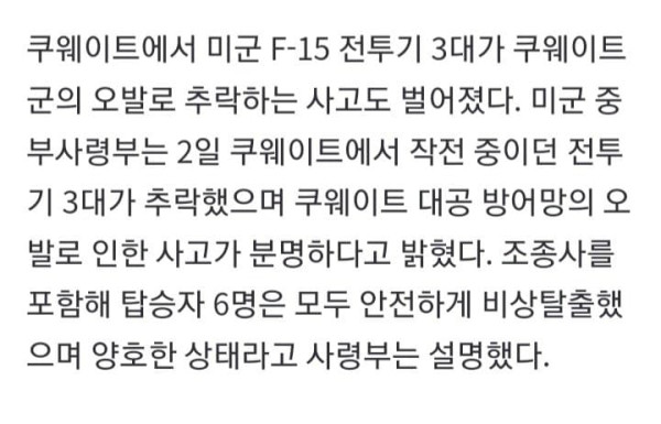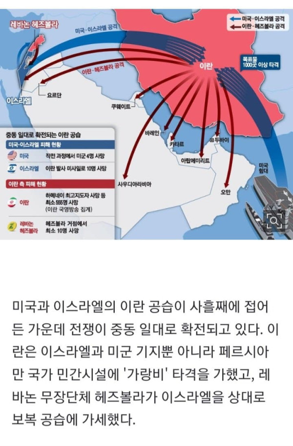 중동전쟁 확전 조짐 이란, 미군 주둔한 국가 노려 호텔 등 민간시설 보복성 공격 '친이란' 헤즈볼라도 전쟁 가담 미군 사망 4명·중상 4명 발생 쿠웨이트서 美전투기 추락 방공망 오발…사망자는 없어 미국과 이스라엘의
