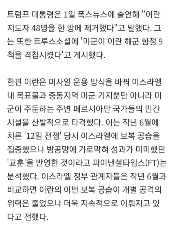 (워싱턴·뉴욕=연합뉴스) 홍정규 이지헌 특파원 = 도널드 트럼프 미국 대통령은 2일(현지시간) 이란에 지상군을 투입할 가능성을 배제하지 않는다는 입장을 시사했다. 이란을 상대로 한 추가 대규모 공격 가능성도 시사했다.