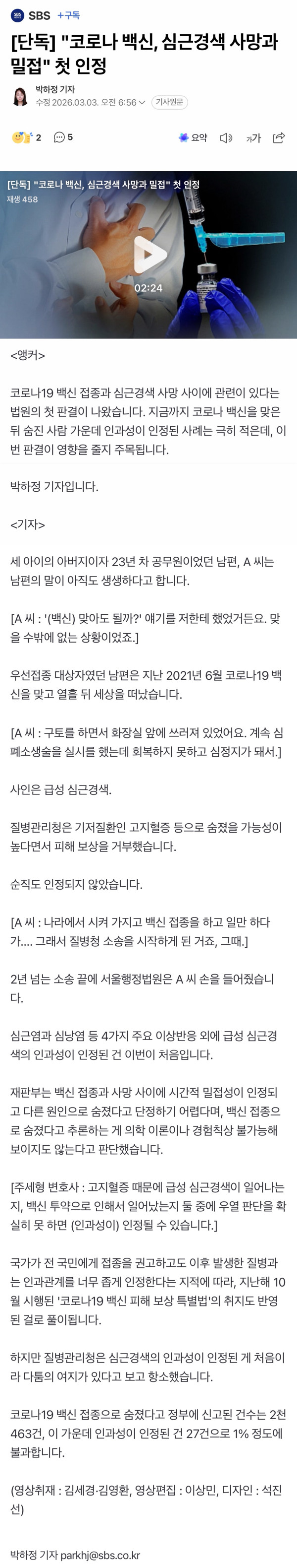 코로나19 백신 접종과 심근경색 사망 사이에 관련이 있다는 법원의 첫 판결이 나왔습니다. 지금까지 코로나 백신을 맞은 뒤 숨진 사람 가운데 인과성이 인정된 사례는 극히 적은데, 이번 판결이 영향을 줄지 주목됩니다.