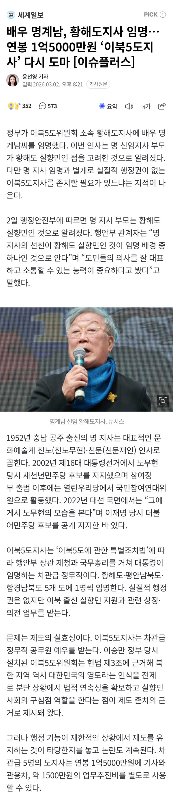 '李 지지' 배우 명계남, 차관급 황해도지사 임명外