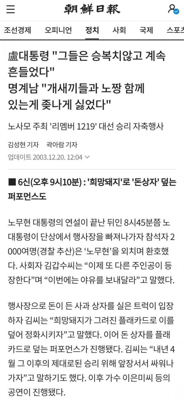 盧대통령 그들은 승복치않고 계속 흔들었다명계남 개새끼들과 노짱 함께 있는게 좆나게 싫었다 노사모 주최 리멤버 1219 대선 승리 자축행사