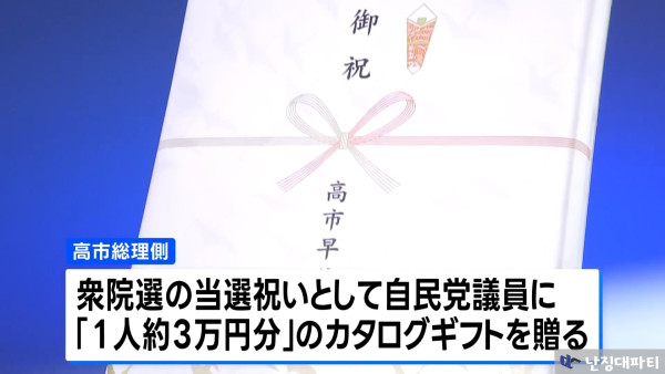 다카이치는 연임에 성공한 지 한 주만에 논란의 중심에 섰음 최근 총선에서 당선된 자민당 의원들에게 건넨 축하 선물이 문제가 된 것 의원 315명에게 인당 약 30만원 상당의 백화점 '카탈로그 기프트'를 준 것으로 알려