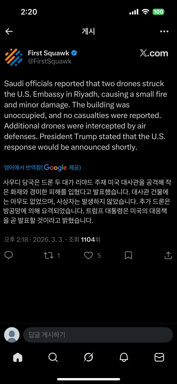 [속보] 사우디 미대사관 드론 공격당해...
