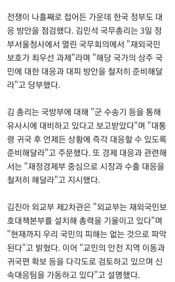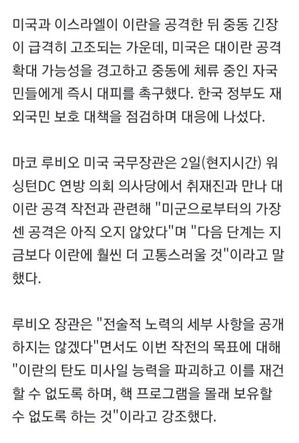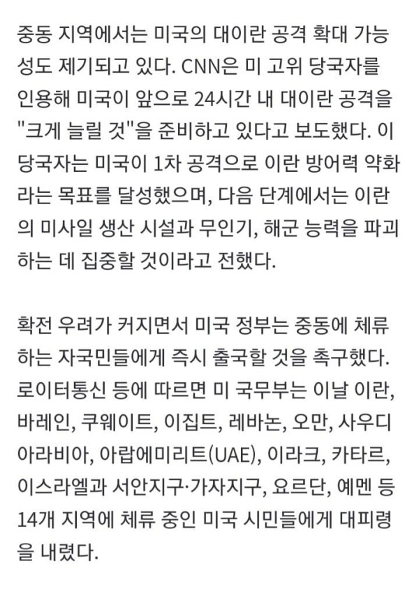 미국과 이스라엘이 이란을 공격한 뒤 중동 긴장이 급격히 고조되는 가운데, 미국은 대이란 공격 확대 가능성을 경고하고 중동에 체류 중인 자국민들에게 즉시 대피를 촉구했다. 한국 정부도 재외국민 보호 대책을 점검하며 대