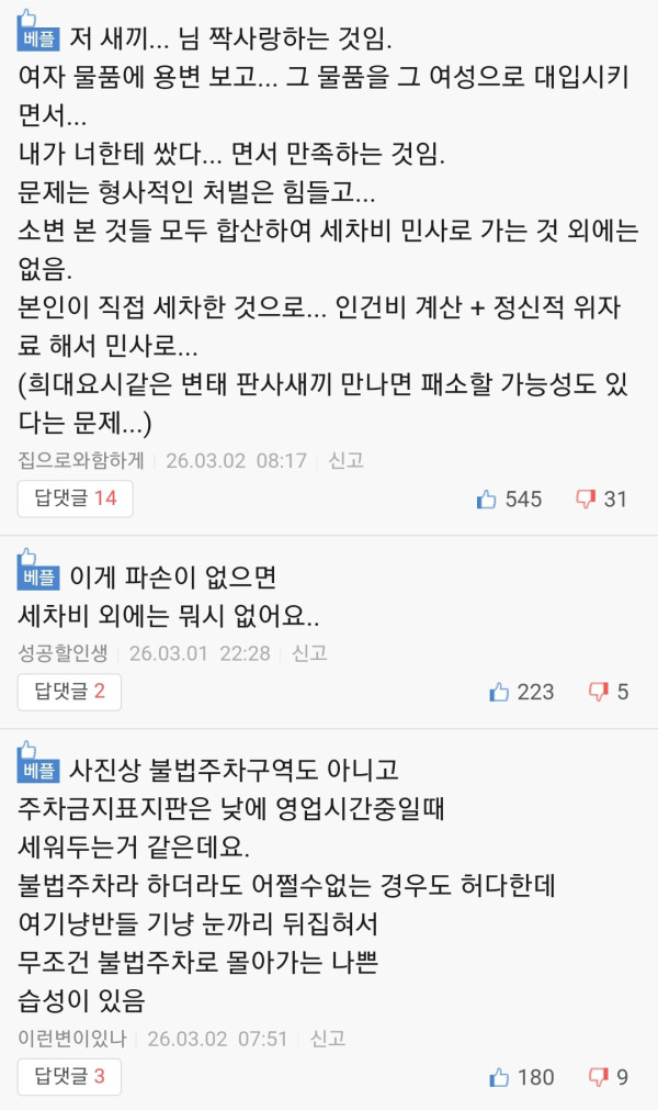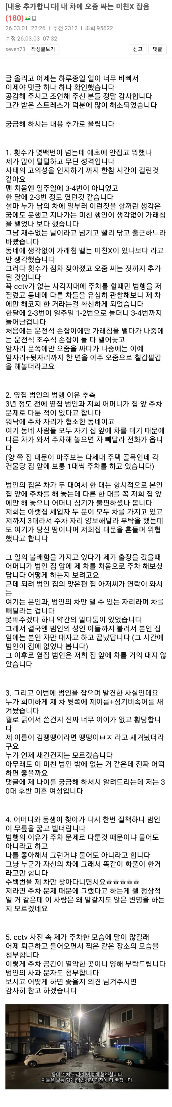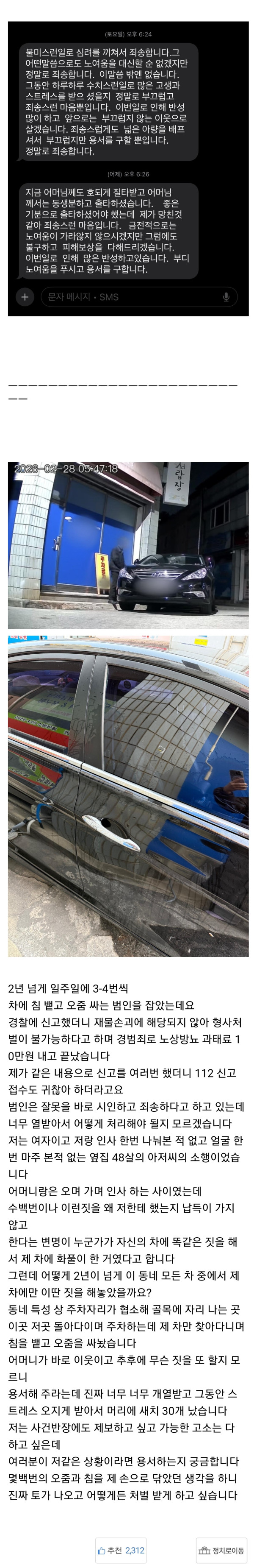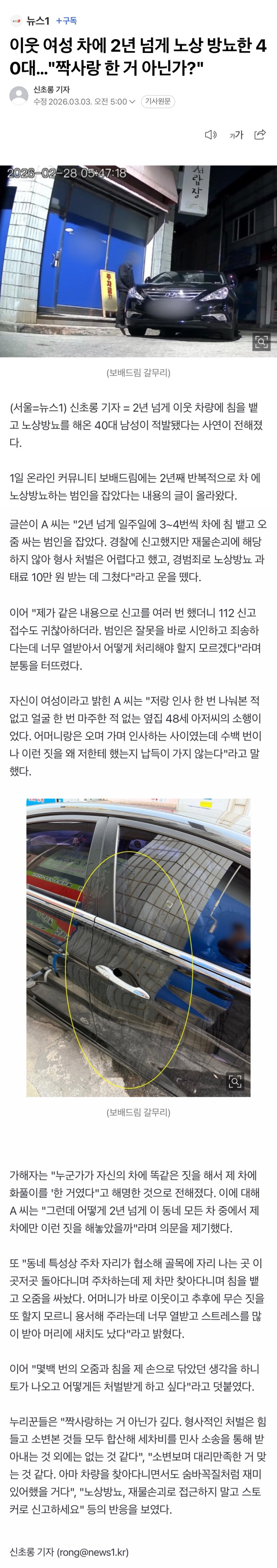 이웃 여성 차에 2년 넘게 노상 방뇨한 영포티 ㄷㄷ