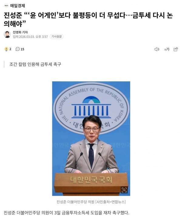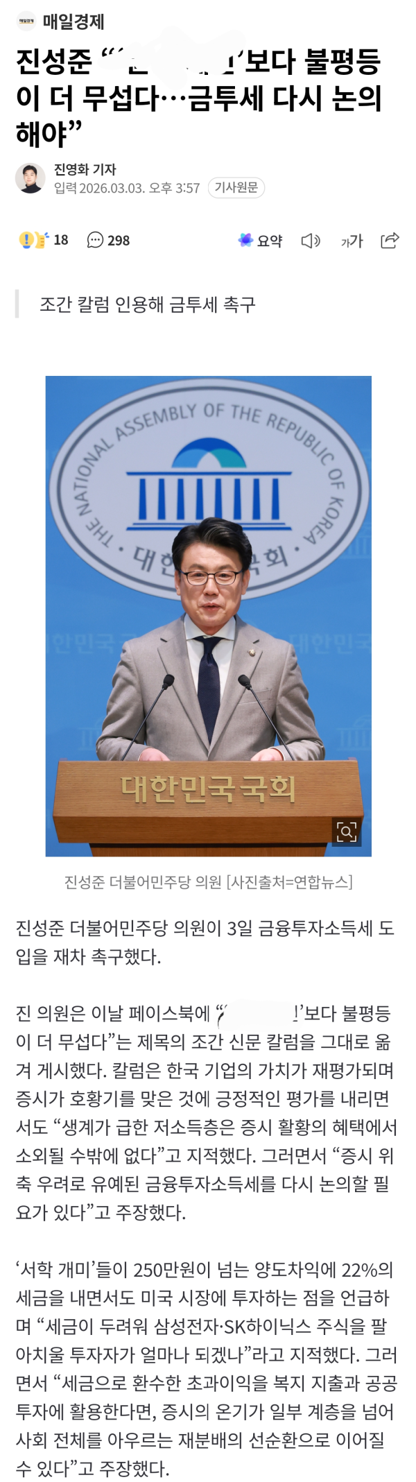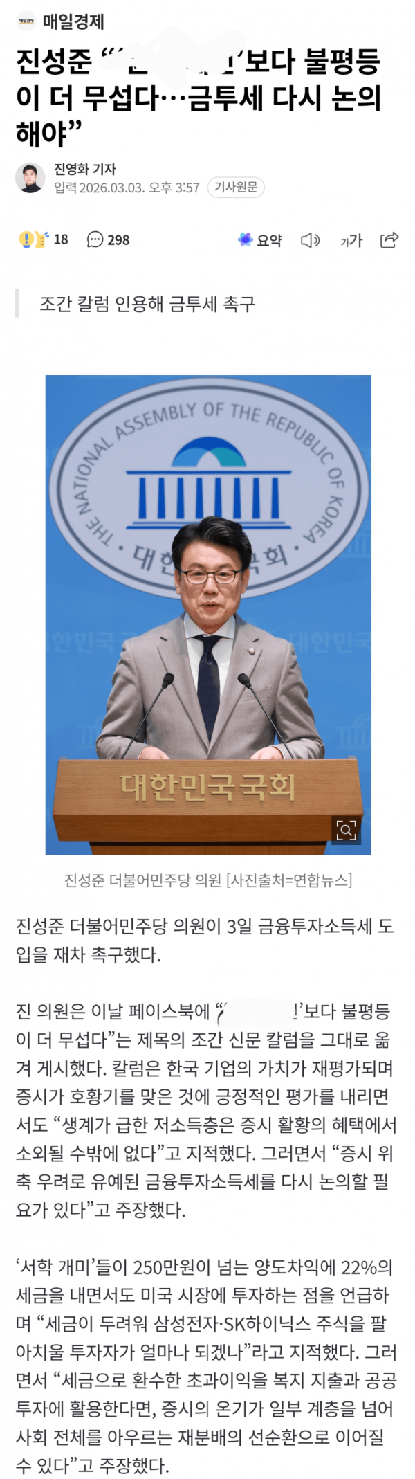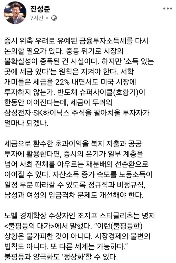 조간 칼럼 인용해 금투세 촉구 진성준 더불어민주당 의원이 3일 금융투자소득세 도입을 재차 촉구했다. 진 의원은 이날 페이스북에 “‘윤 어게인’보다 불평등이 더 무섭다”는 제목의 조간 신문 칼럼을 그대로 옮겨 게시했다