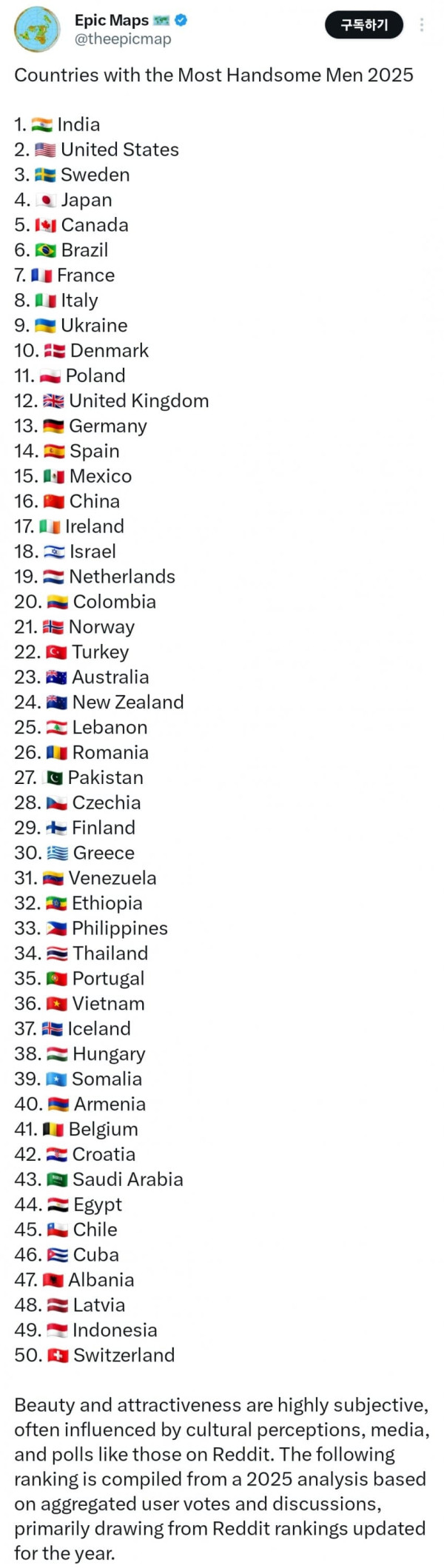 싱글벙글 세계에서 가장 잘생긴 사람이 많은 나라 순위