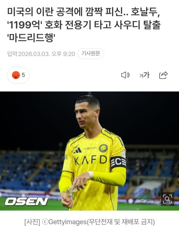 미국의 이란 공격에 깜짝 피신.. 호날두, '1199억' 호화 전용기 타고 사우디 탈출 '마드리드행'