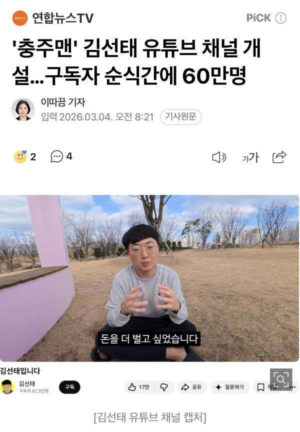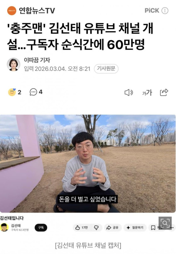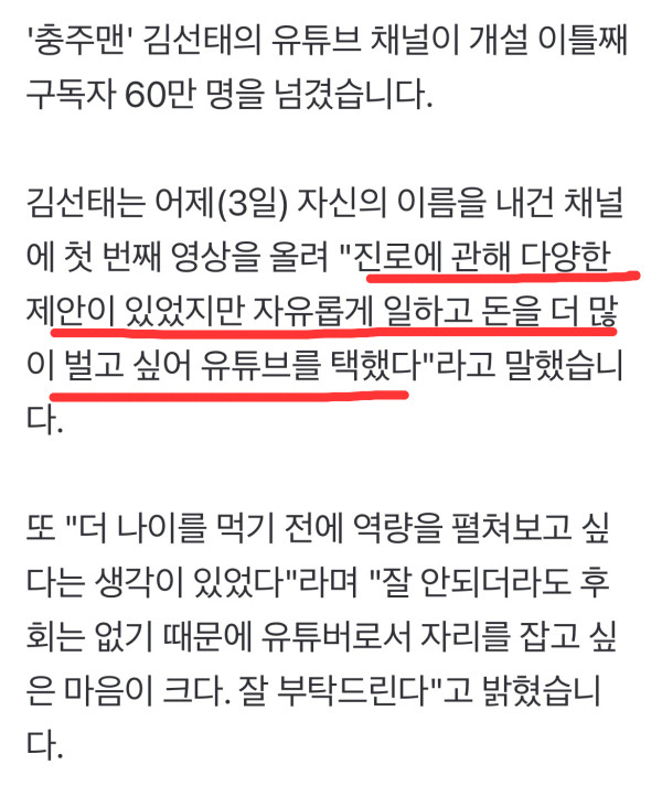 '충주맨' 김선태의 유튜브 채널이 개설 이틀째 구독자 60만 명을 넘겼습니다. 김선태는 어제(3일) 자신의 이름을 내건 채널에 첫 번째 영상을 올려 "진로에 관해 다양한 제안이 있었지만 자유롭게 일하고 돈을 더 많이