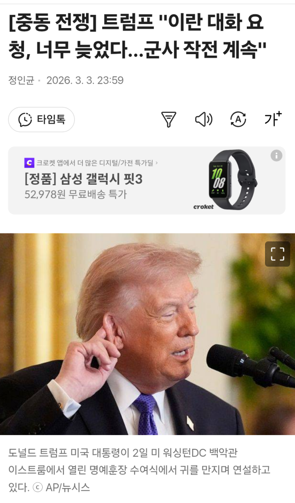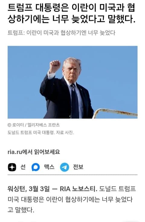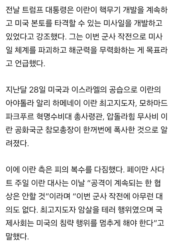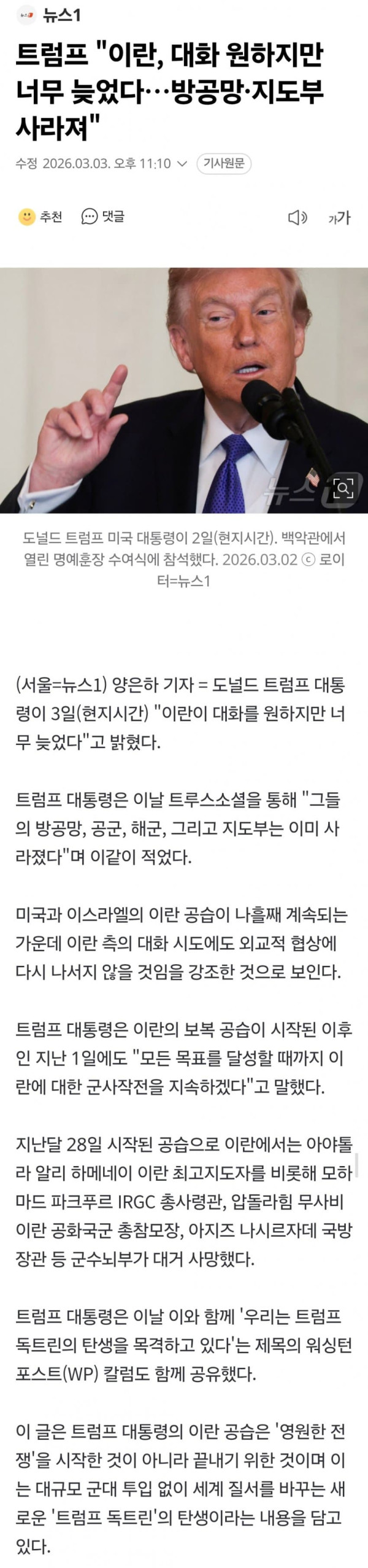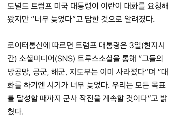 기사 명분없는 전쟁쳐하는 극우트럼프 이란대화요청 너무 늦었다 군사작전계속