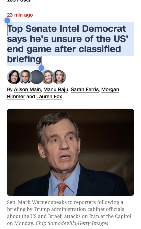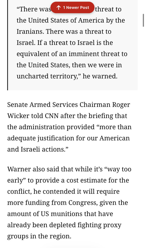 상원 군사위원장인 로저 위커는 브리핑 후 CNN에, 행정부가 “미국과 이스라엘의 행동에 대해 충분하고도 남는 정당성(more than adequate justification)을 제시했다”고 말했다.