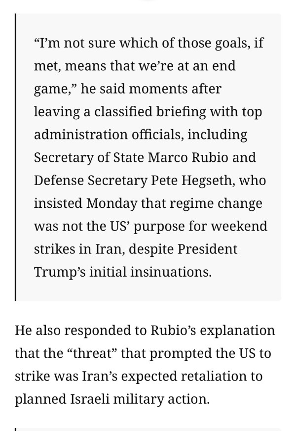 그는 마코 루비오 국무장관과 피트 헤그세스 국방장관 등 행정부 고위 인사들과의 기밀 브리핑을 마치고 나온 직후 이렇게 말했다. 이들은 월요일, 주말 동안의 이란 공습 목적이 정권 교체(regime change) 는 아니었다고 거듭 주장했다. 다만 이는 트럼프 대통령이 처음에는 그런 뉘앙스를 풍겼던 것과는 배치된다.