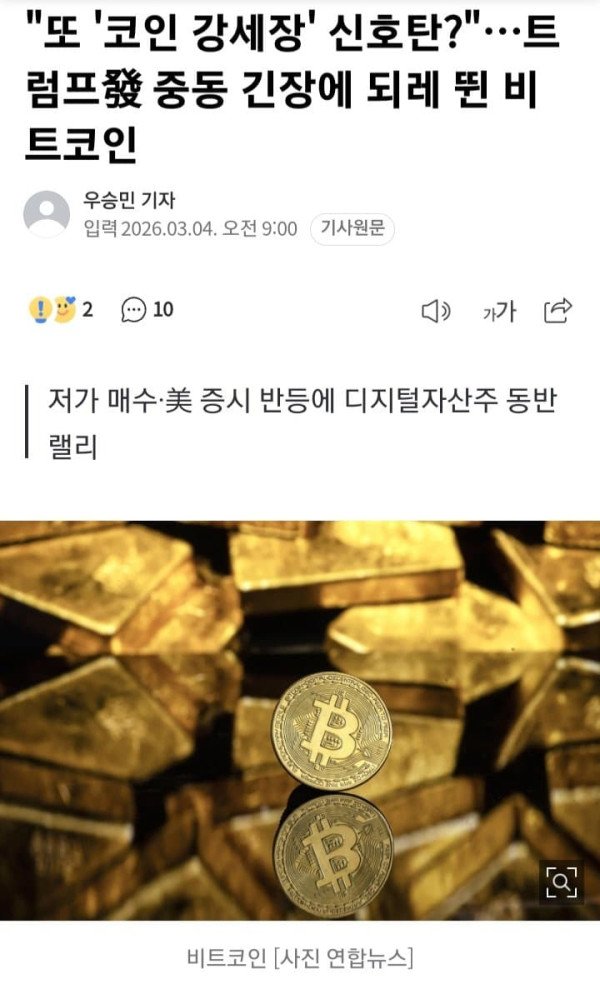 "또 '코인 강세장' 신호탄?"…중동 긴장에 되레 뛴 비트코인