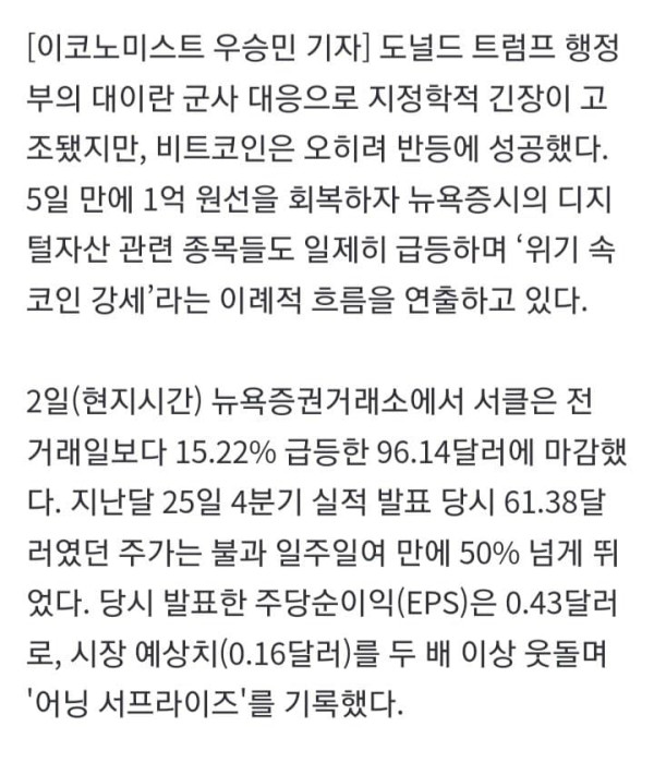 도널드 트럼프 행정부의 대이란 군사 대응으로 지정학적 긴장이 고조됐지만, 비트코인은 오히려 반등에 성공했다. 5일 만에 1억 원선을 회복하자 뉴욕증시의 디지털자산 관련 종목들도 일제히 급등하며 ‘위기 속 코인 강세’