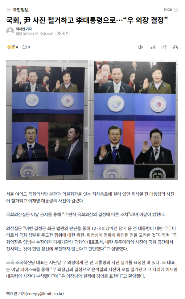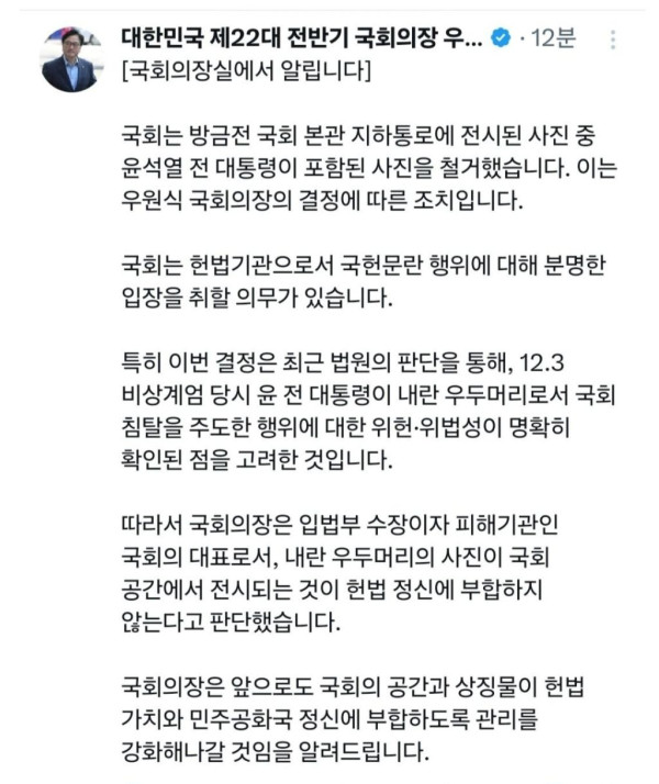 국회, 尹 사진 철거하고 李대통령으로…“우 의장 결정”