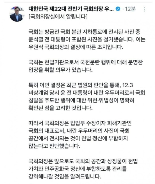 조국 요청으로 우원식 의장이 결정해서 조치됐대