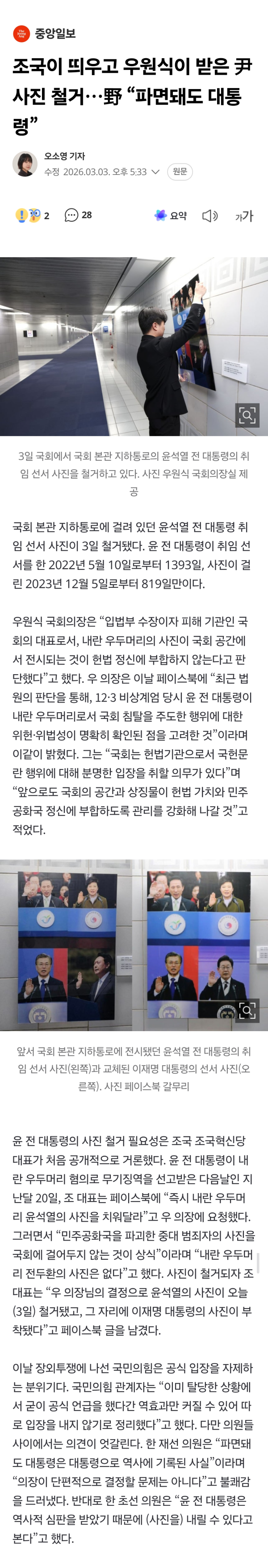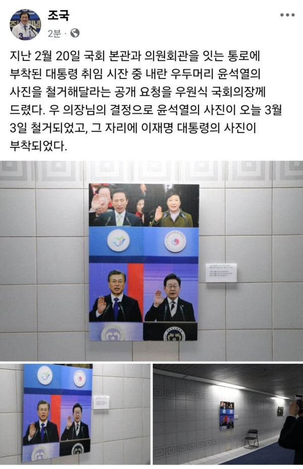 국회 본관-의원회관 잇는 통로에 윤두창 사진 떼고 잼통 사진 붙임