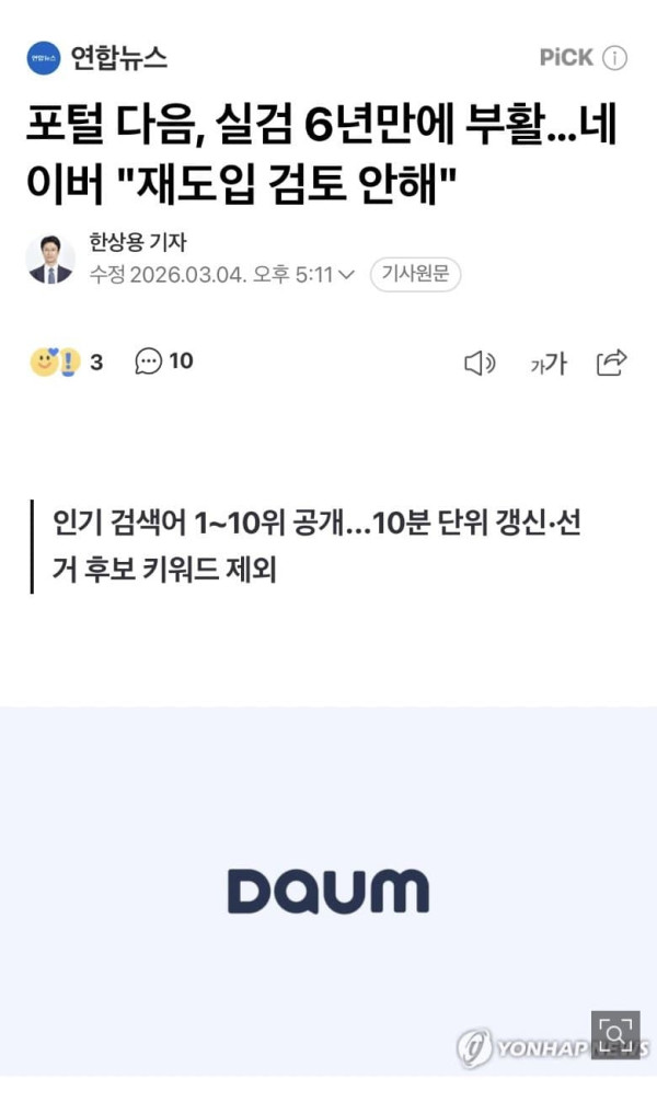 포털 다음, 실검 6년만에 부활…네이버 "재도입 검토 안해"