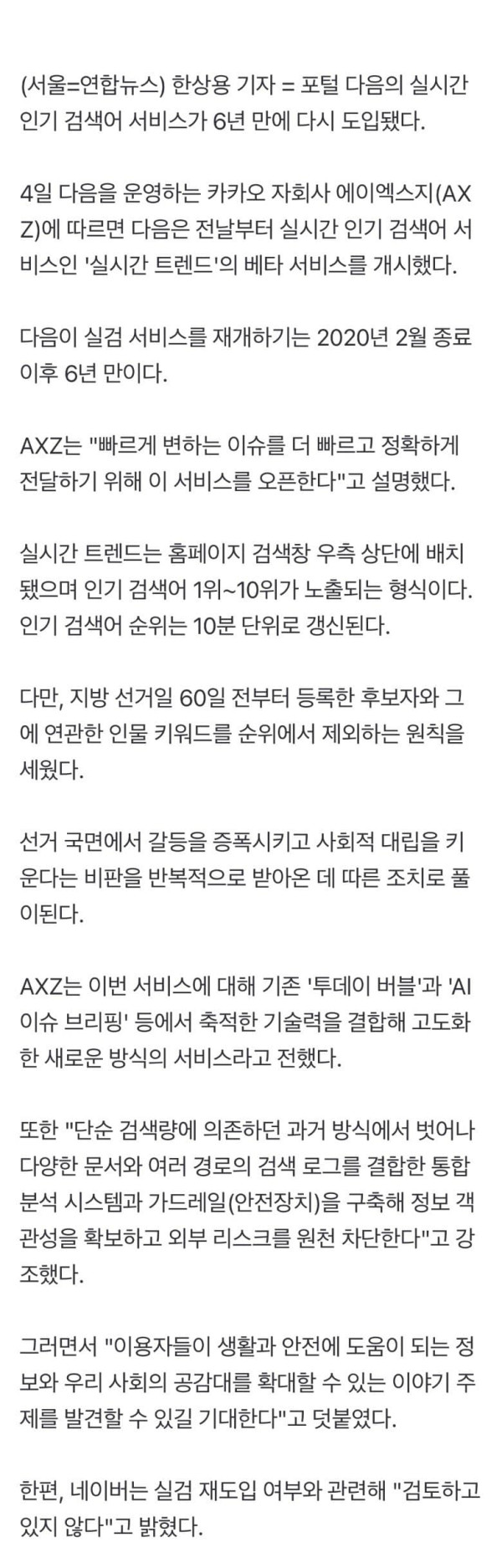인기 검색어 1~10위 공개…10분 단위 갱신·선거 후보 키워드 제외 포털 다음의 실시간 인기 검색어 서비스가 6년 만에 다시 도입됐다. 4일 다음을 운영하는 카카오 자회사 에이엑스지(AXZ)에 따르면 다음은 전날부