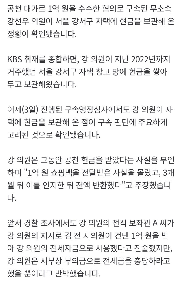 공천 대가로 1억 원을 수수한 혐의로 구속된 무소속 강선우 의원이 서울 강서구 자택에 현금을 보관해 온 정황이 확인됐습니다. KBS 취재를 종합하면, 강 의원이 지난 2022년까지 거주했던 서울 강서구 자택 창고 방