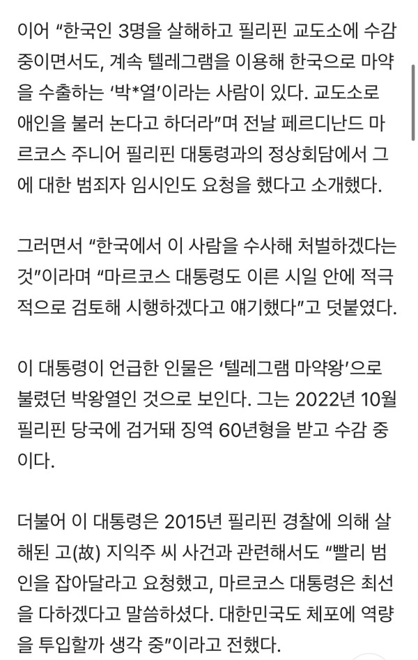 필리핀에 수감된 한국인 마약왕 임시인도 요청