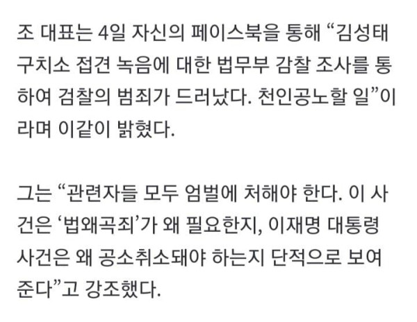 [속보] 조국 “김성태 녹취록은 검찰 범죄의 증거…李사건 공소취소해야”