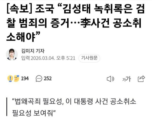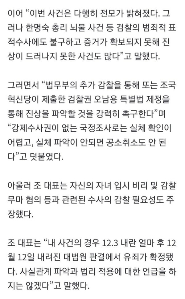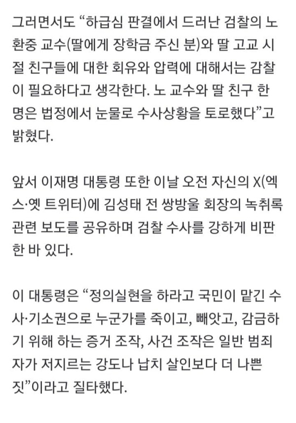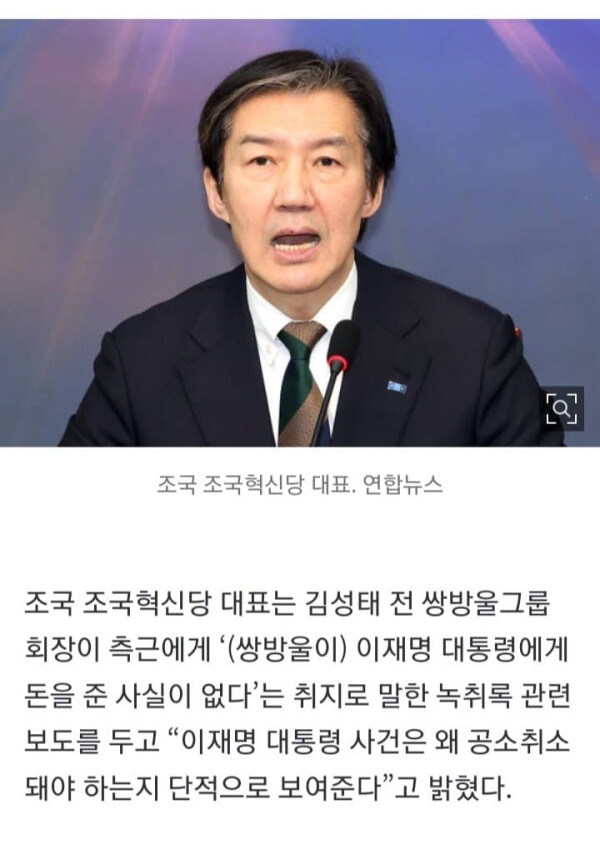조국 조국혁신당 대표는 김성태 전 쌍방울그룹 회장이 측근에게 ‘(쌍방울이) 이재명 대통령에게 돈을 준 사실이 없다’는 취지로 말한 녹취록 관련 보도를 두고 “이재명 대통령 사건은 왜 공소취소돼야 하는지 단적으로 보여